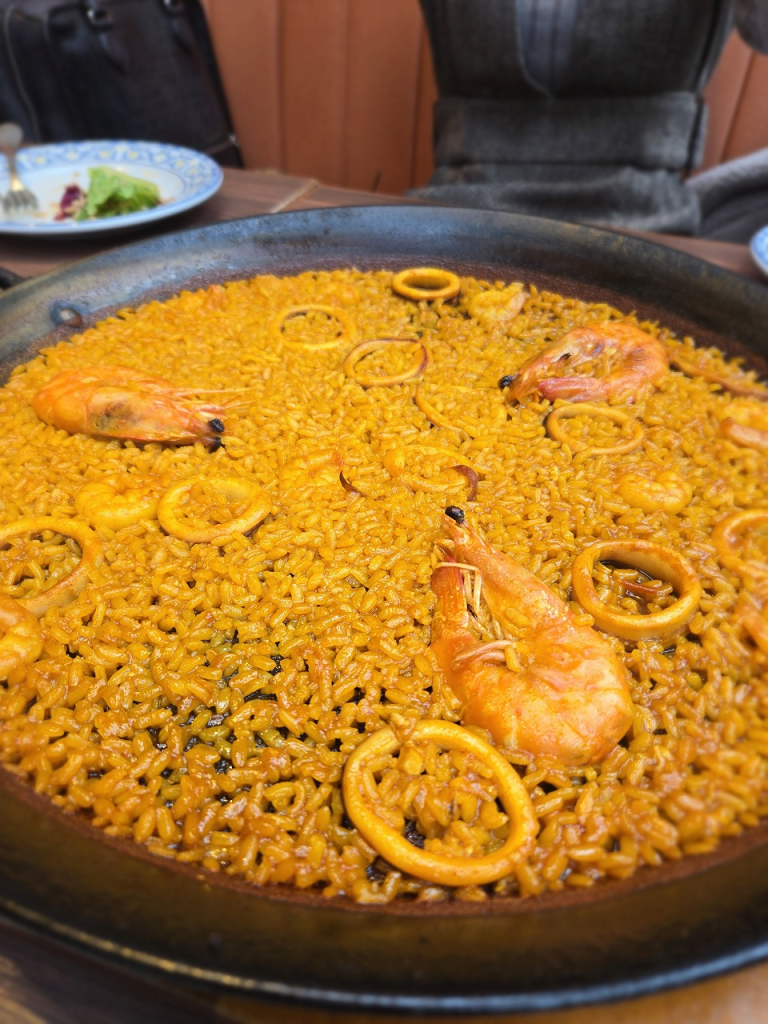 大きなパエリア鍋で仕上げられる本格パエリアは、サフランの香りが豊かで、エビ、イカなどがたっぷりと盛り付けられた見た目にも美しい一品。