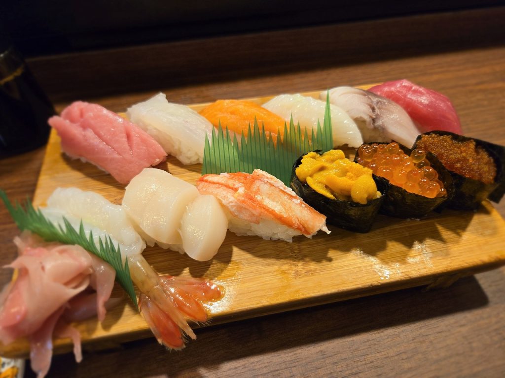 カウンター席に座ると、目の前のネタケースには色とりどりの新鮮な魚介が並びます。職人さんが丁寧に握ってくださる姿を眺めながら、北海道の海の幸を存分に味わう贅沢な時間です。