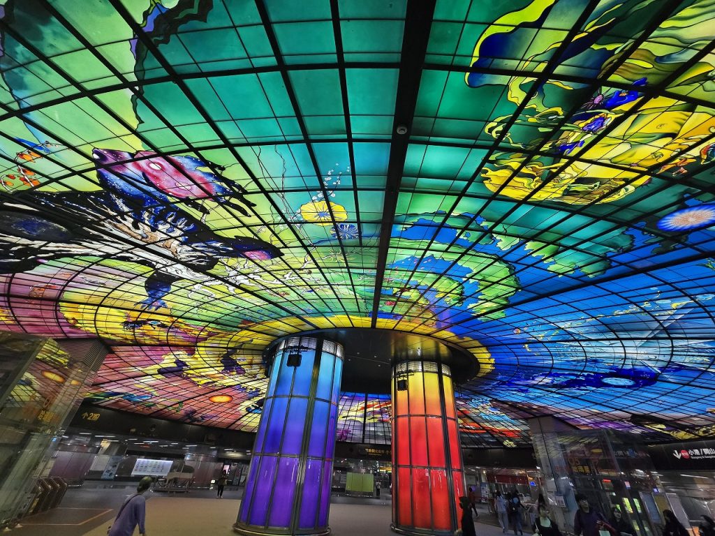 天井一面に広がる色鮮やかなステンドグラス「光之穹頂」は、まさに芸術作品。青、緑、黄色、紫と、様々な色が渦を巻くように配置され、圧倒的な美しさです。