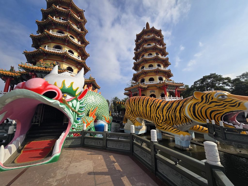 池のほとりに建つ「龍虎塔」は、龍の口から入り虎の口から出ることで厄除けになるといわれています。カラフルな龍と虎のモニュメントは写真映えも抜群で、青空の下、七重の塔が美しくそびえ立っていました。